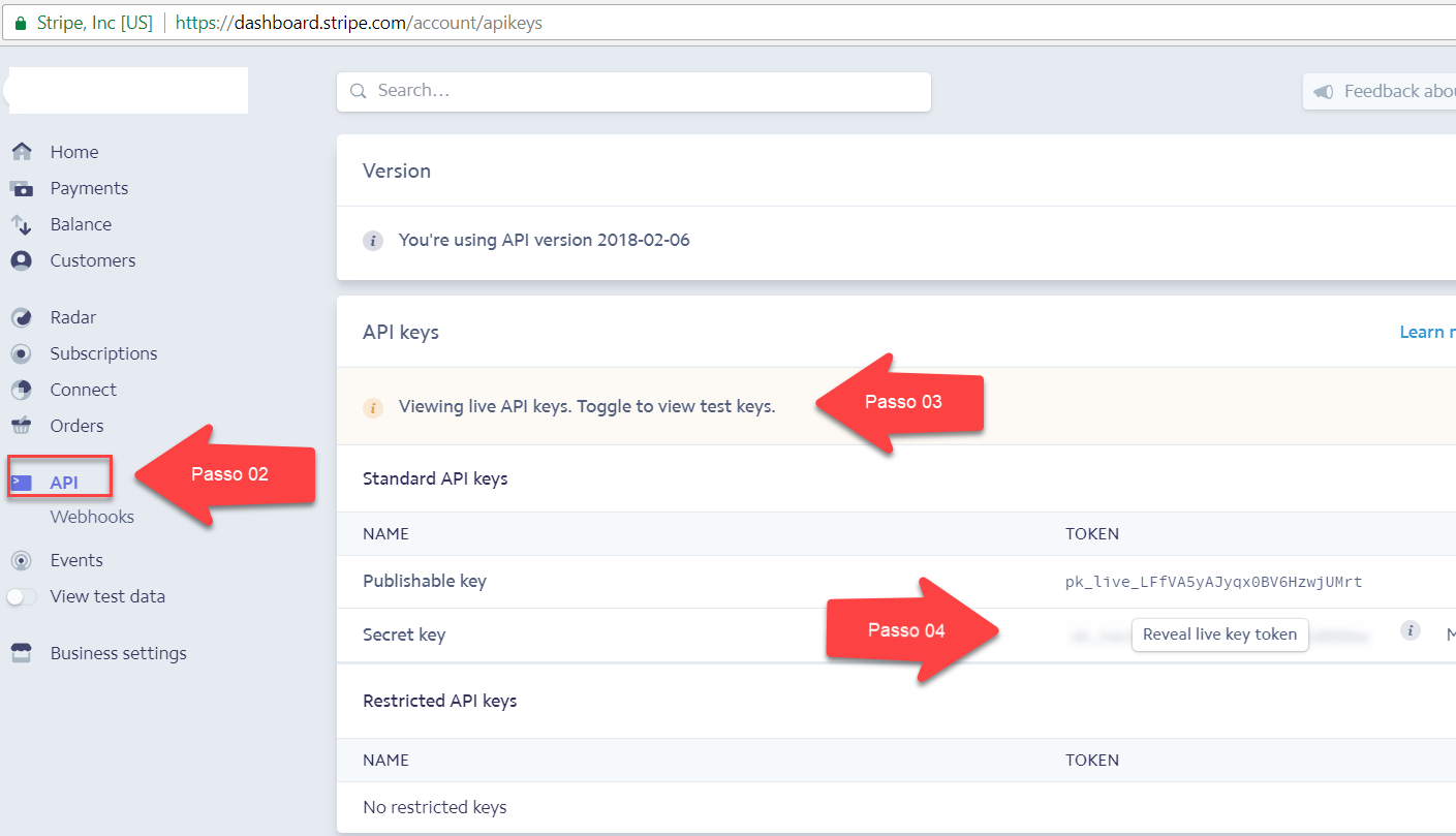 3. Verifique se as chaves API exibidas na tela estão em modo Live;